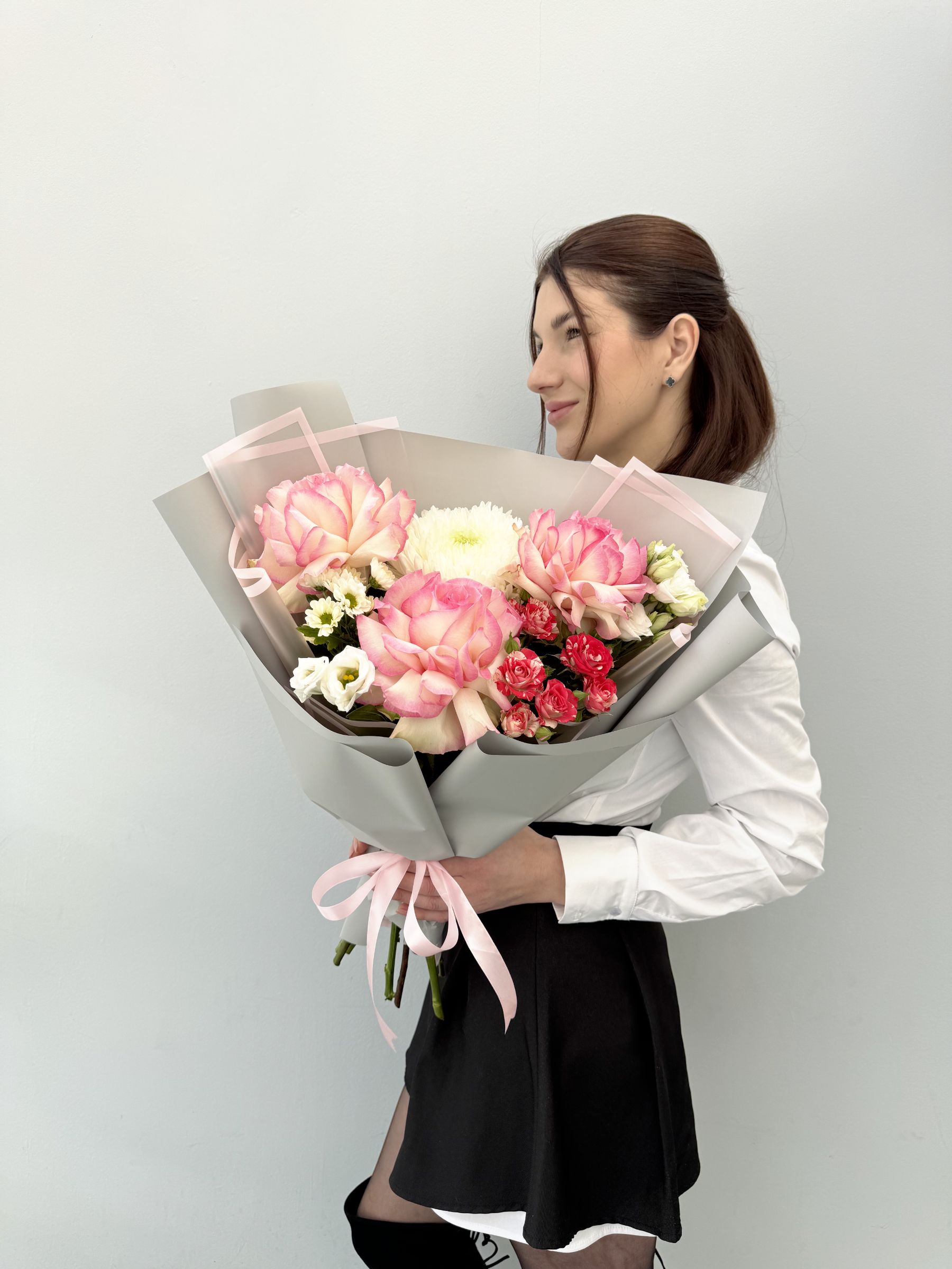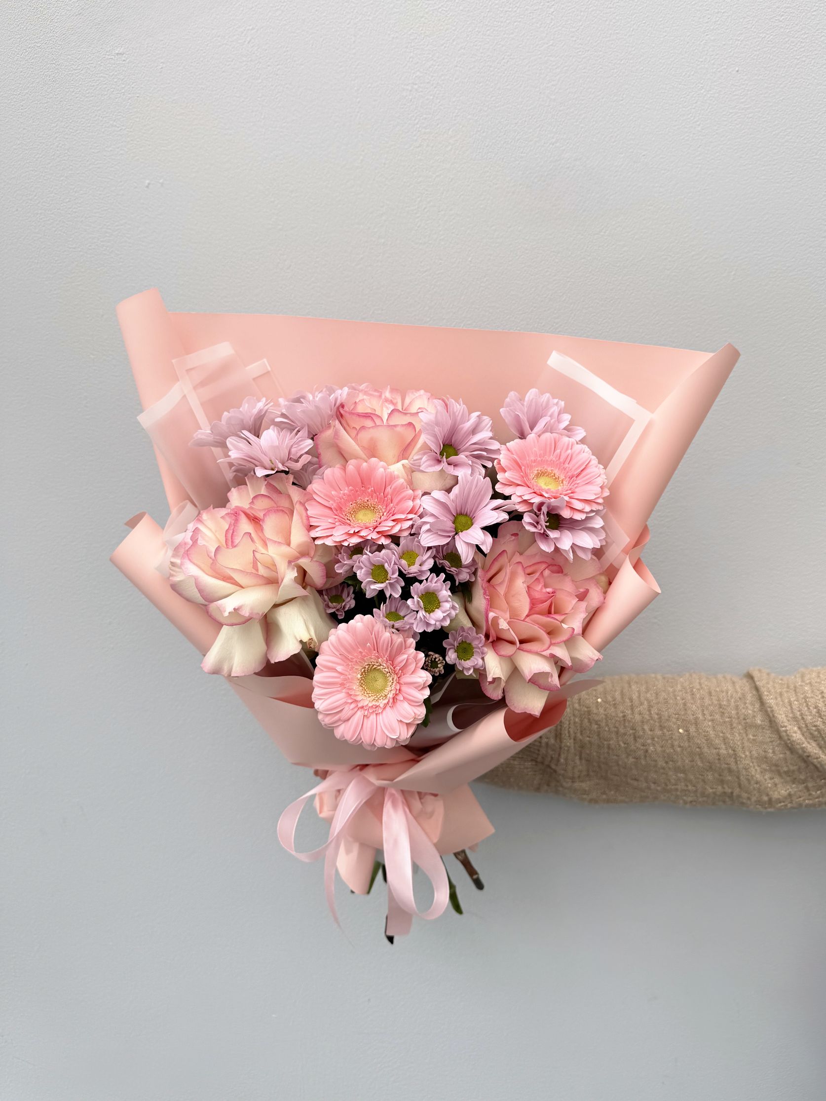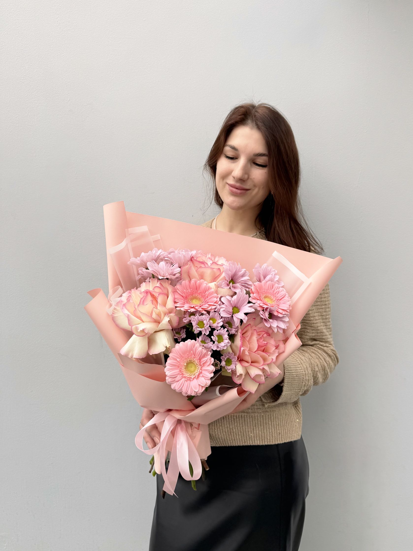 Букет сочетает нежно-розовые розы с герберами и сиреневыми хризантемами, создавая мягкий, изящный ритм. Пастельная упаковка подчёркивает лёгкость и утончённость композиции, где каждый цветок словно дышит вместе с букетом, передавая тихую гармонию и ощущение бережного обещания.