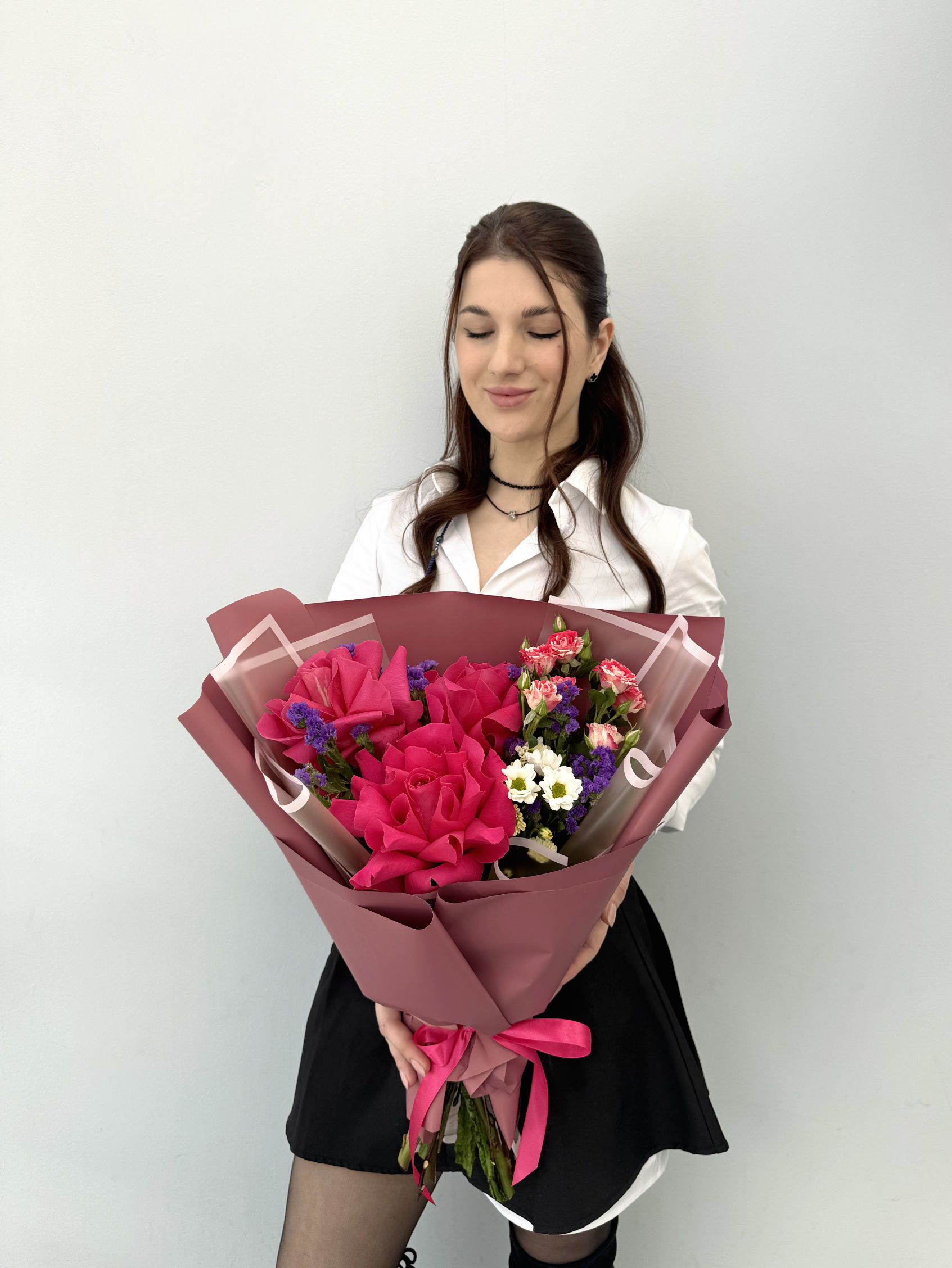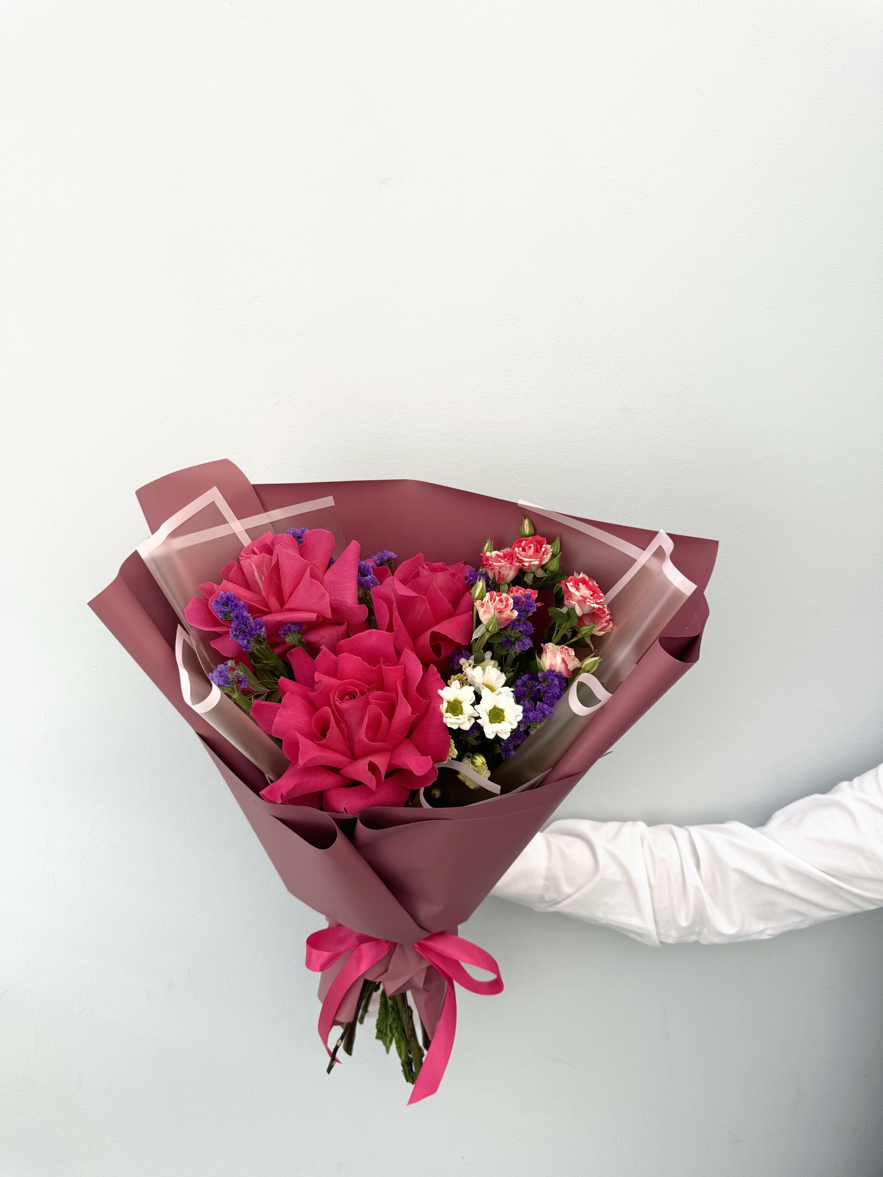 Букет сочетает насыщенно-розовые розы с мини-гвоздиками, белой хризантемой и сиреневой статицей, создавая яркий, динамичный ритм. Тёмно-бордовая упаковка подчёркивает насыщенность оттенков, а прозрачные вставки и лента добавляют лёгкость, делая композицию одновременно энергичной и утончённой.