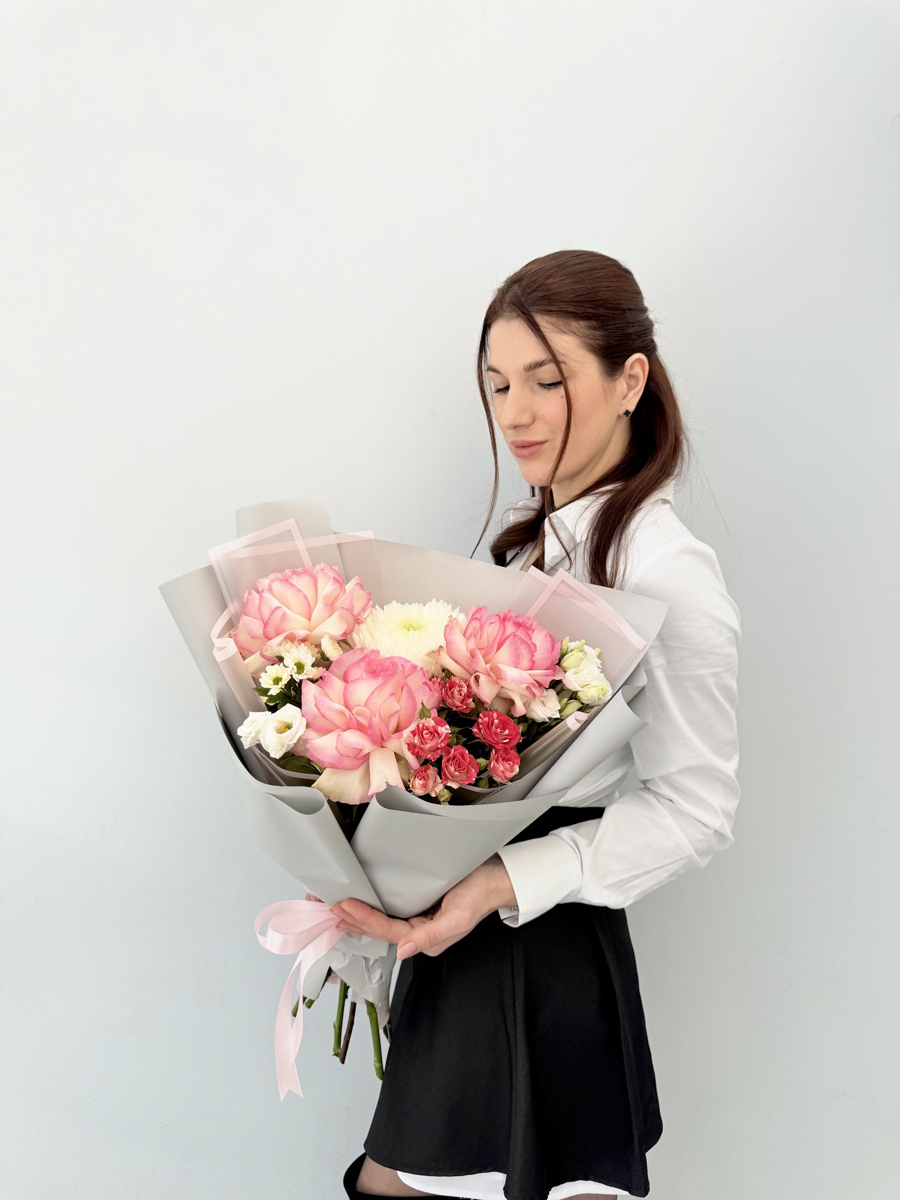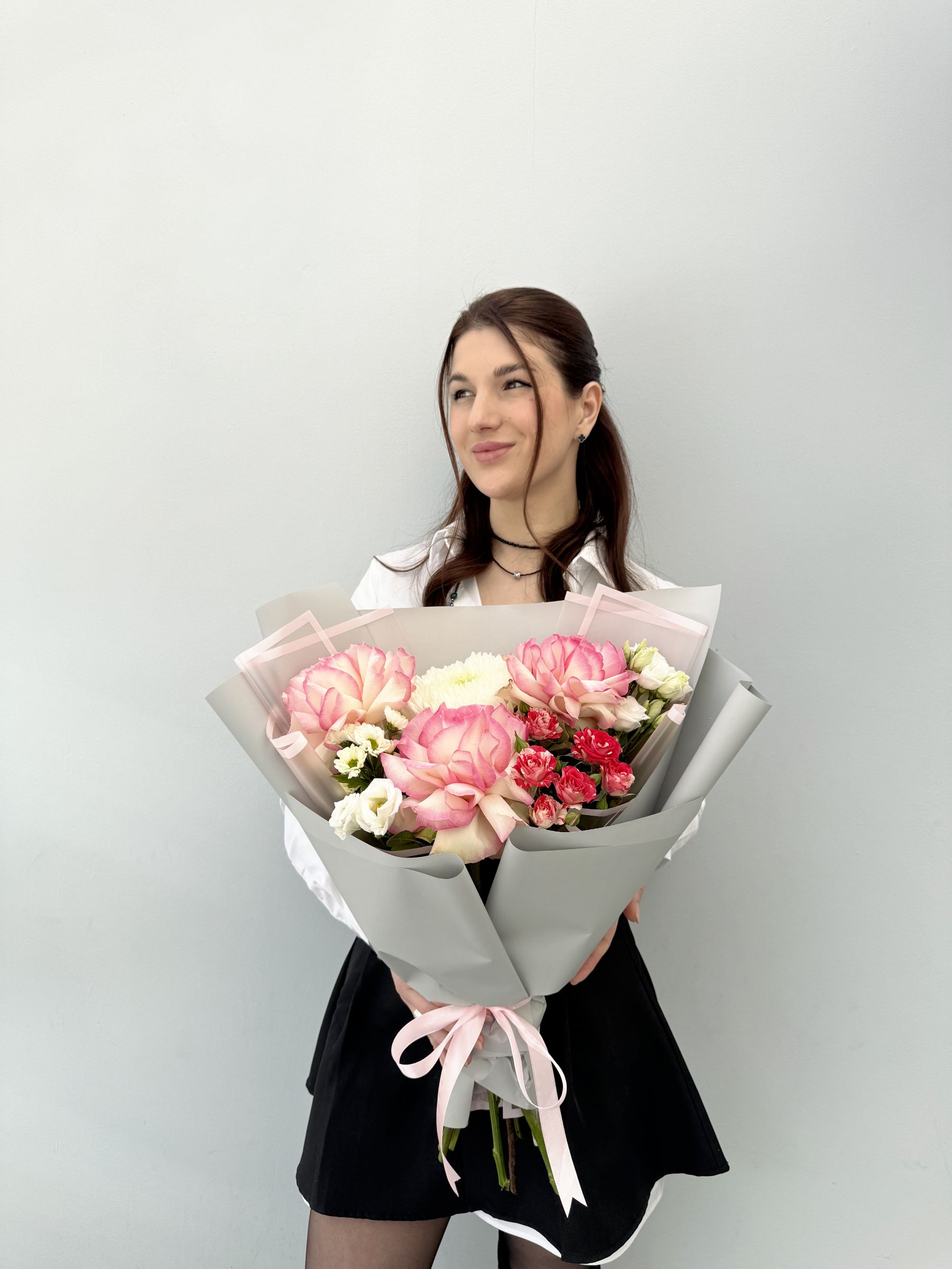 Этот очаровательный букет, словно цветущий сад, дарит ощущение безмятежного счастья и летнего тепла. Нежные розы, пышные гермини, очаровательные кустовые хризантемы, стойкие гвоздики, изящные кустовые гвоздики, милые сантини и зелень сплетаются в единую композицию, наполняя пространство ароматом лета и свежести!