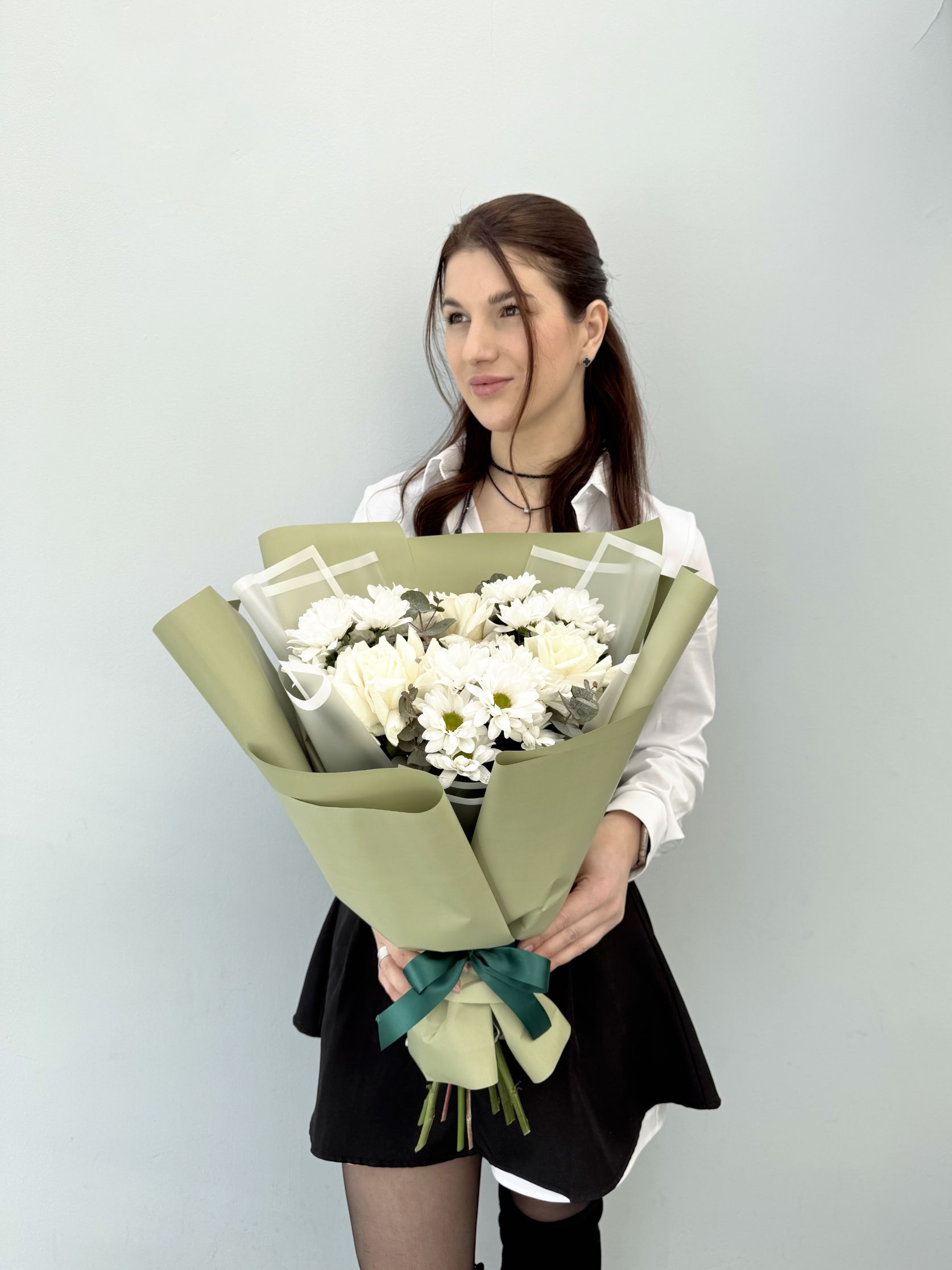 Утончённая композиция, где кремовые розы и нежные хризантемы раскрываются на фоне свежей зелени эвкалипта и декоративной капусты, а экзотические орхидеи цимбидиум придают букету благородное изящество. Этот букет словно дыхание утреннего сада — свежий, элегантный и вдохновляющий.