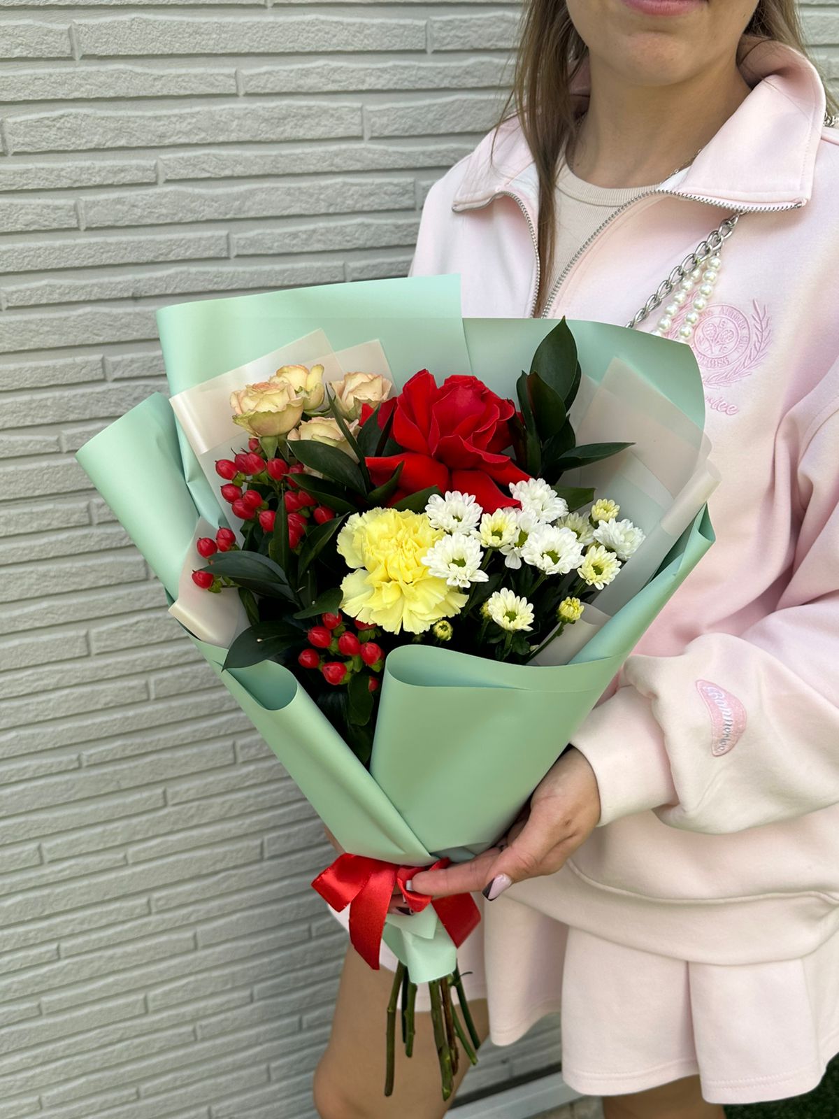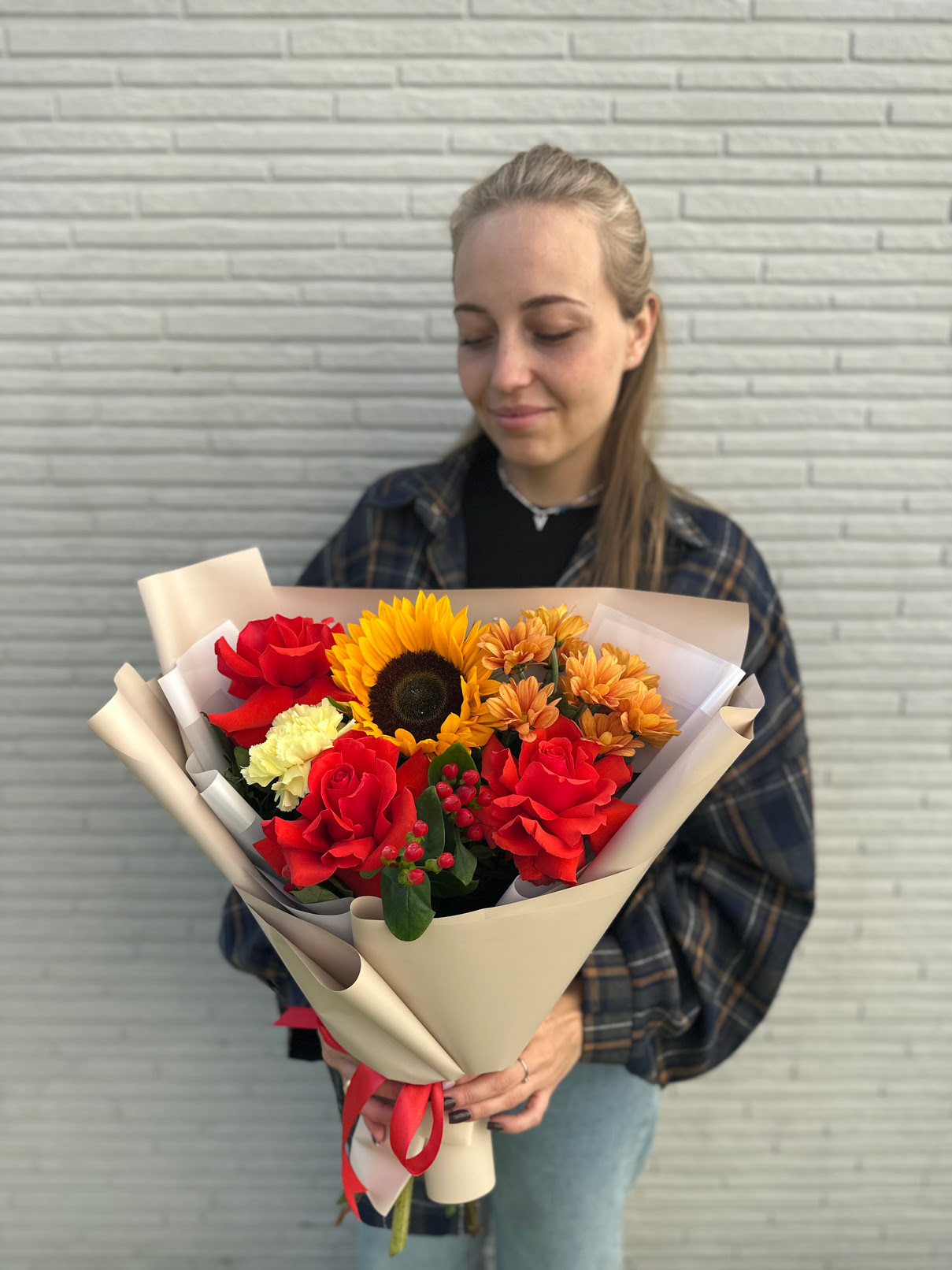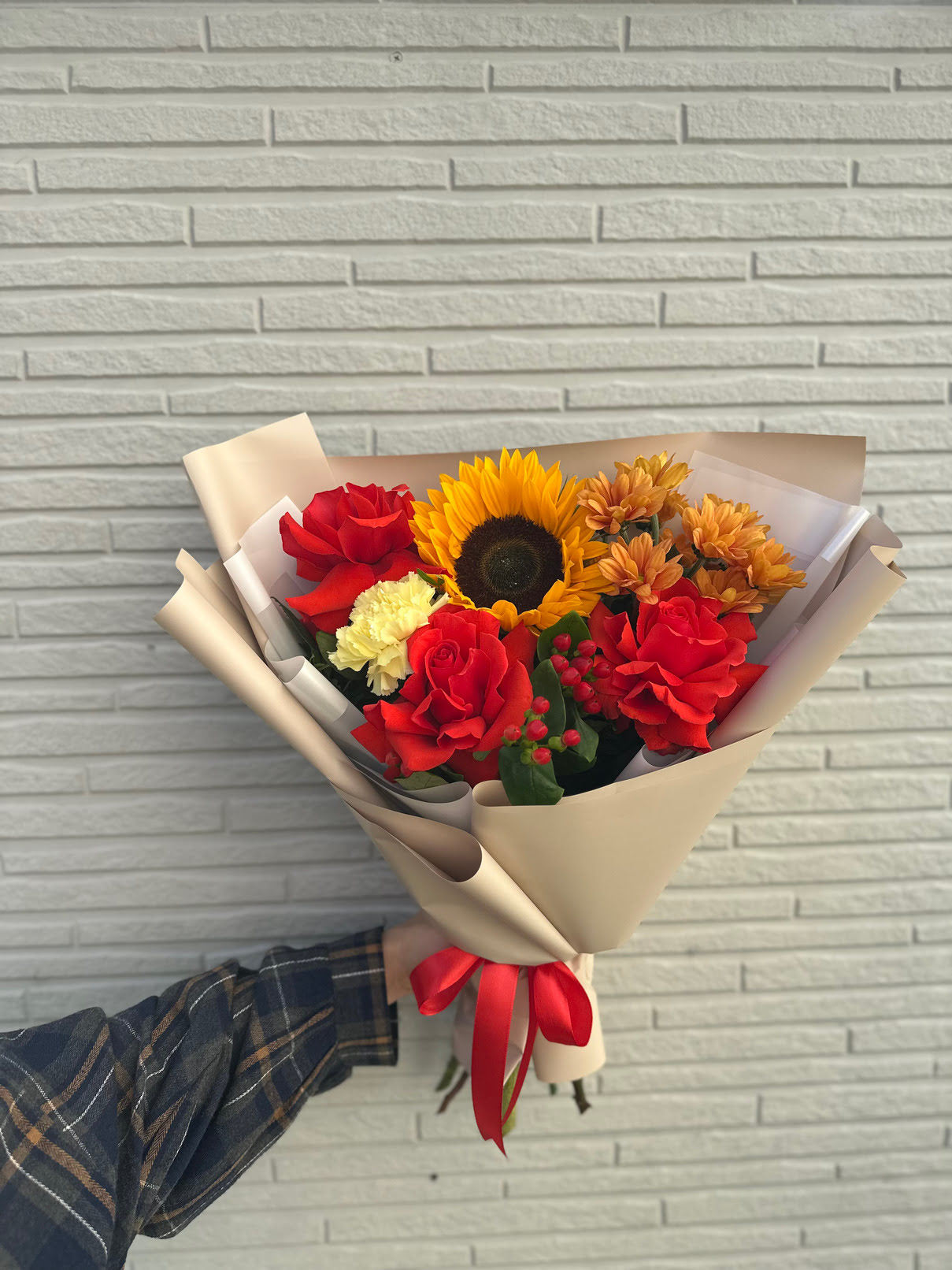 Жизнерадостный букет с ярким подсолнухом в центре, дополненный алыми розами, оранжевыми хризантемами, нежной гвоздикой и акцентом из ягод гиперикума. Светлая упаковка и красная лента подчеркивают насыщенность красок. Такой букет станет символом тепла, радости и энергии — идеальный подарок, чтобы поднять настроение и подарить улыбку.