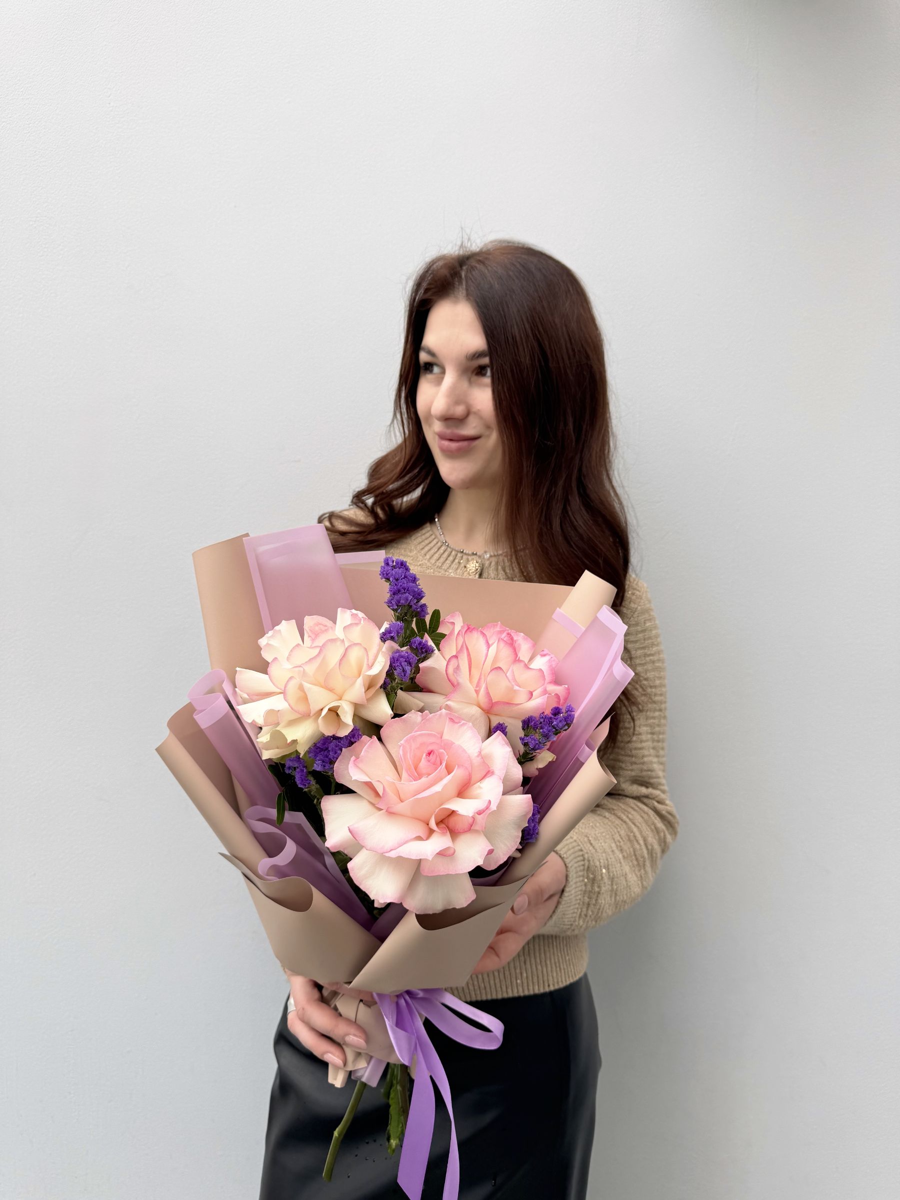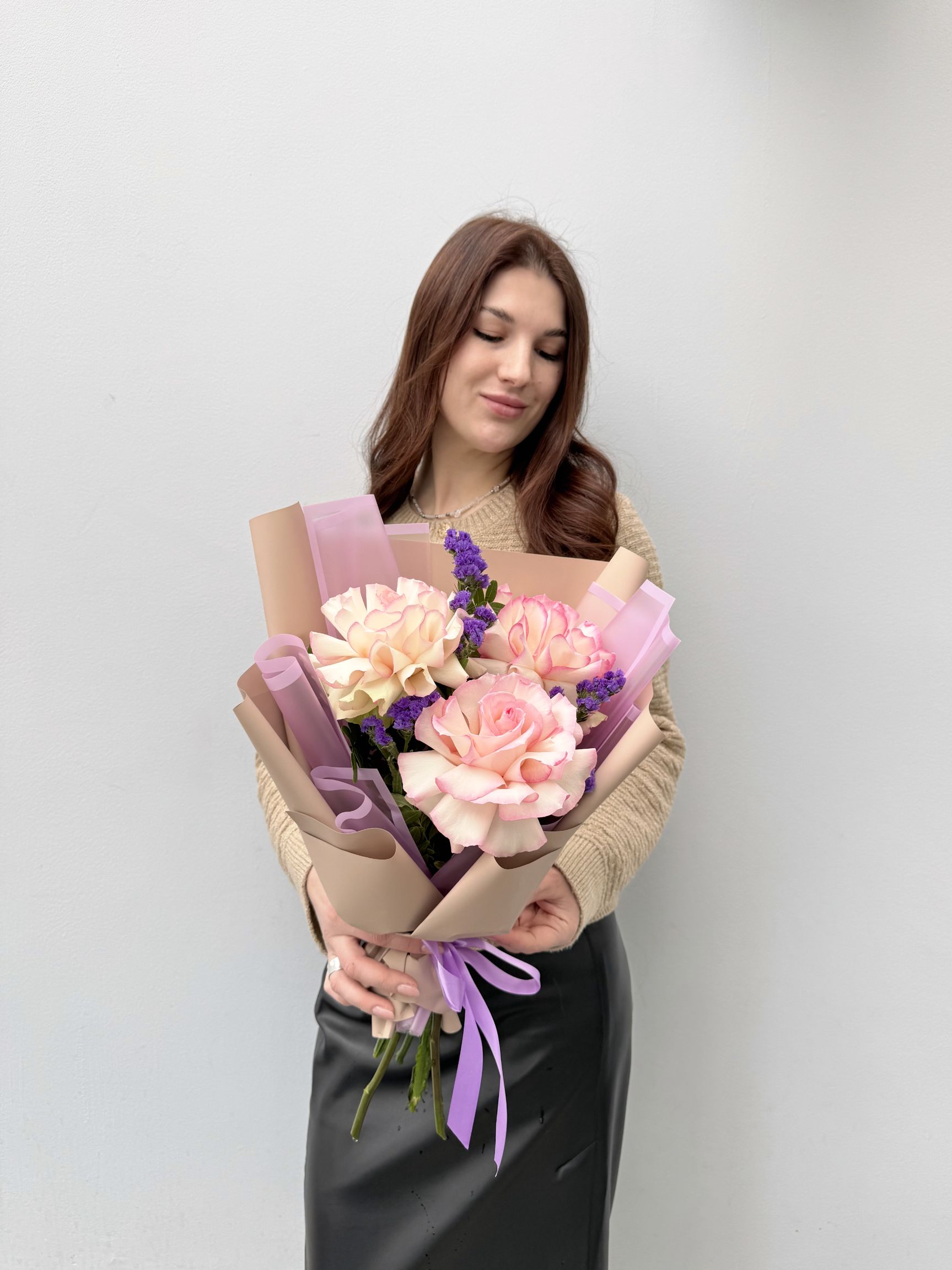 Букет сочетает кремово-розовые розы с акцентами сиреневой статицы, создавая лёгкий контраст света и тени. Минималистичная упаковка в бежевых и сиреневых тонах подчёркивает воздушность композиции, позволяя каждому цветку раскрыться и играть своим ритмом в общей гармонии.