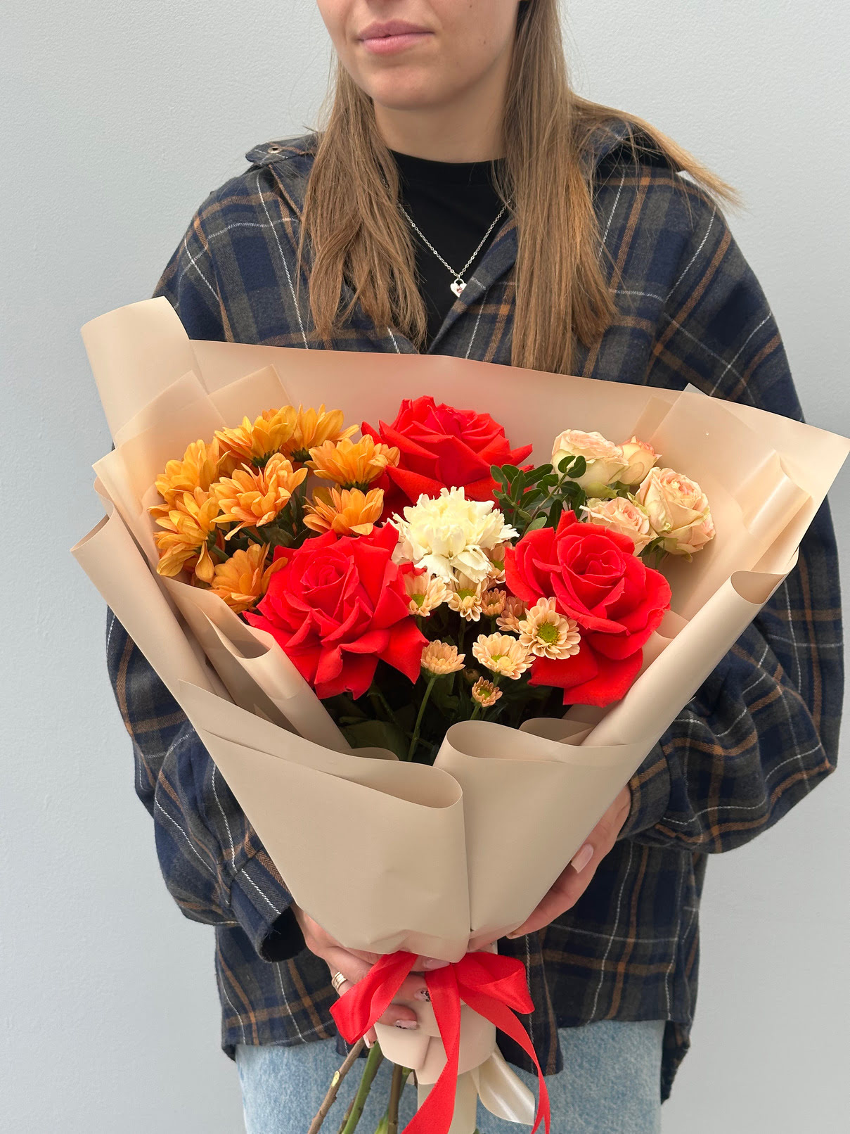 Яркий и тёплый букет, в котором страстные красные розы гармонично сочетаются с солнечными хризантемами, кремовыми гвоздиками и нежными персиковыми розочками. Упаковка в спокойных бежевых тонах с алой лентой подчеркивает красочность цветов. Идеальный выбор для тех, кто хочет подарить радость, энергию и тепло.