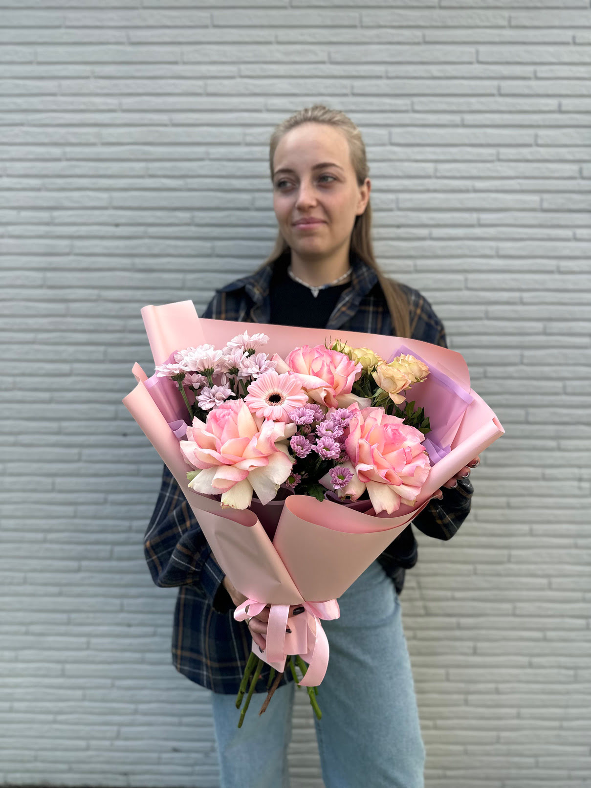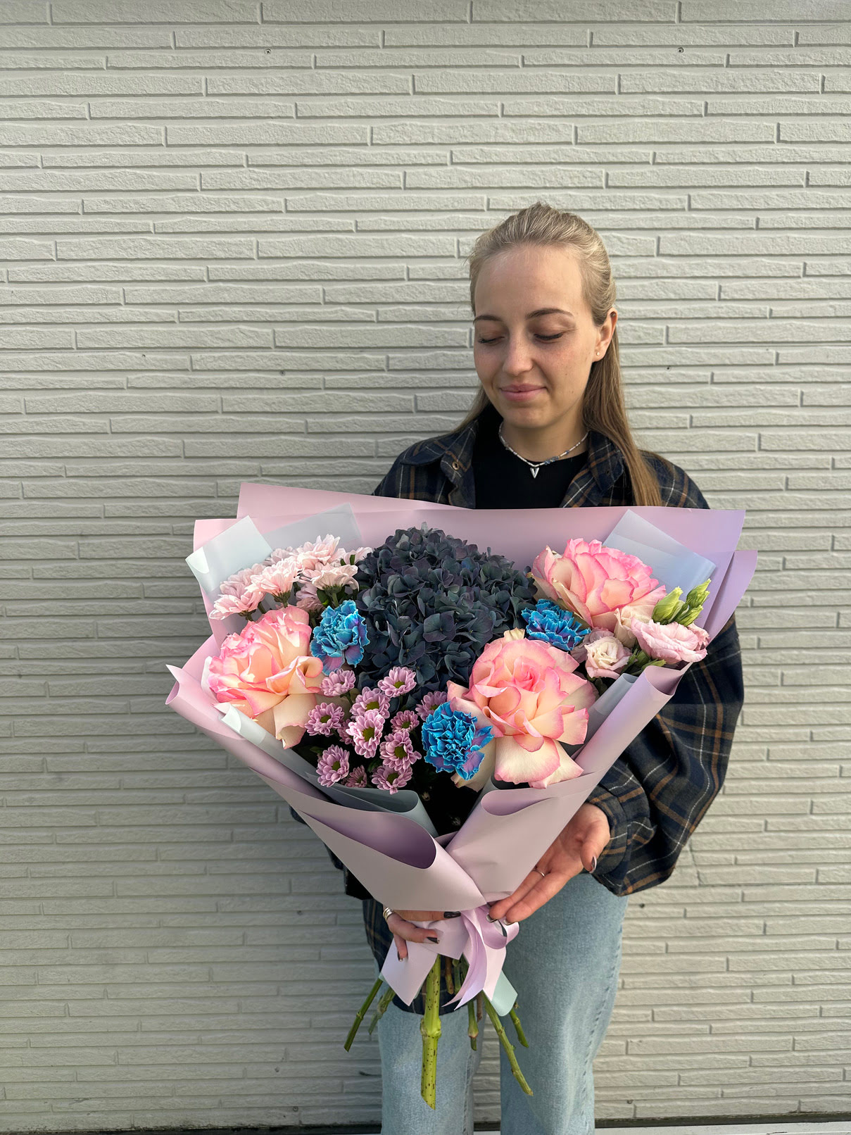 Букет, словно пробуждение раннего утра, когда небо окутано перламутровой дымкой. Воздушная гортензия в оттенке фуксии — как акцент мечты, французские розы с кремово-розовой окантовкой — воплощение нежности, а белые сантини и хризантемы добавляют чистоты и света. Диантус и пушистый лагурус завершают композицию мягкими штрихами утончённости.
