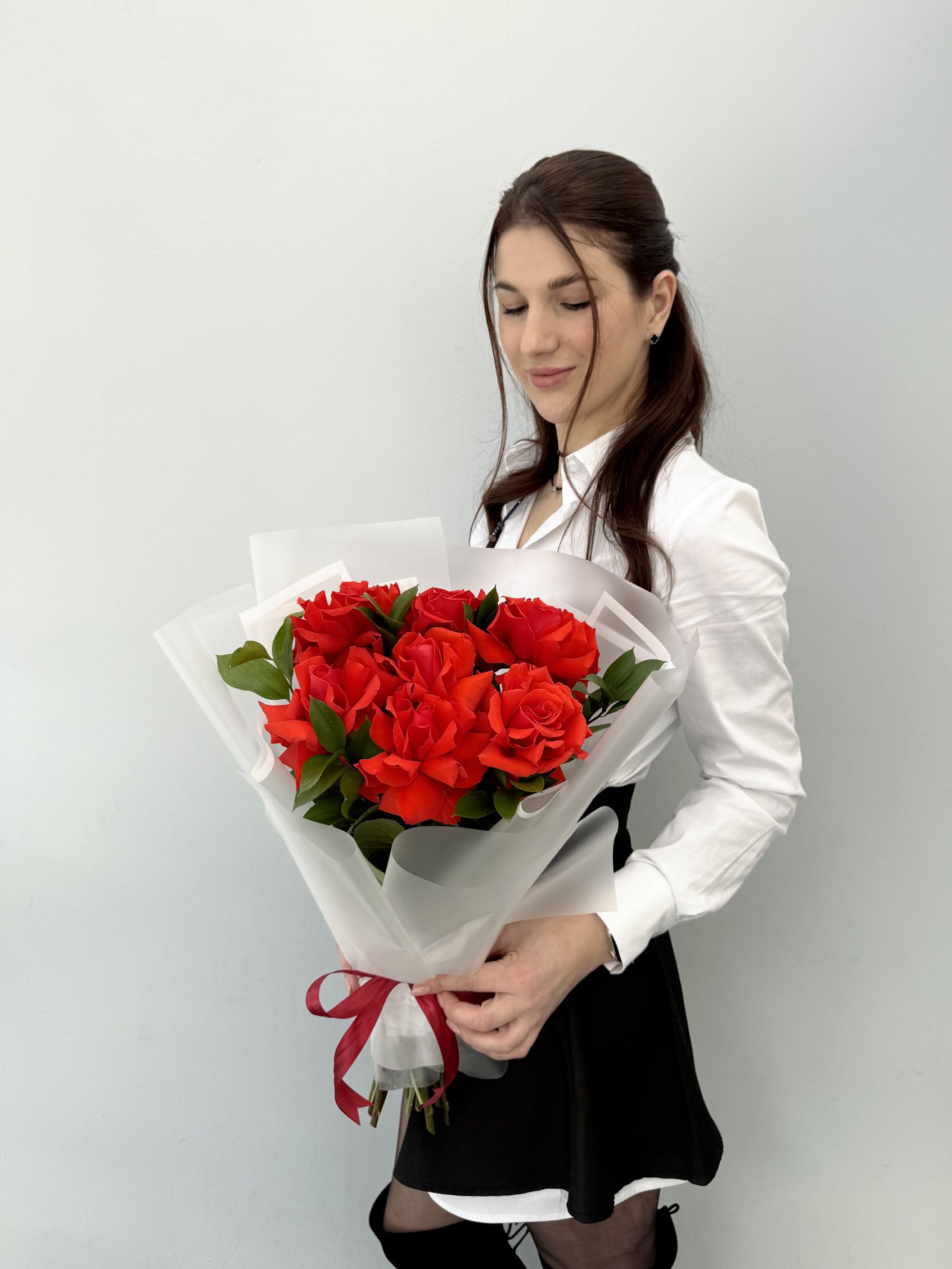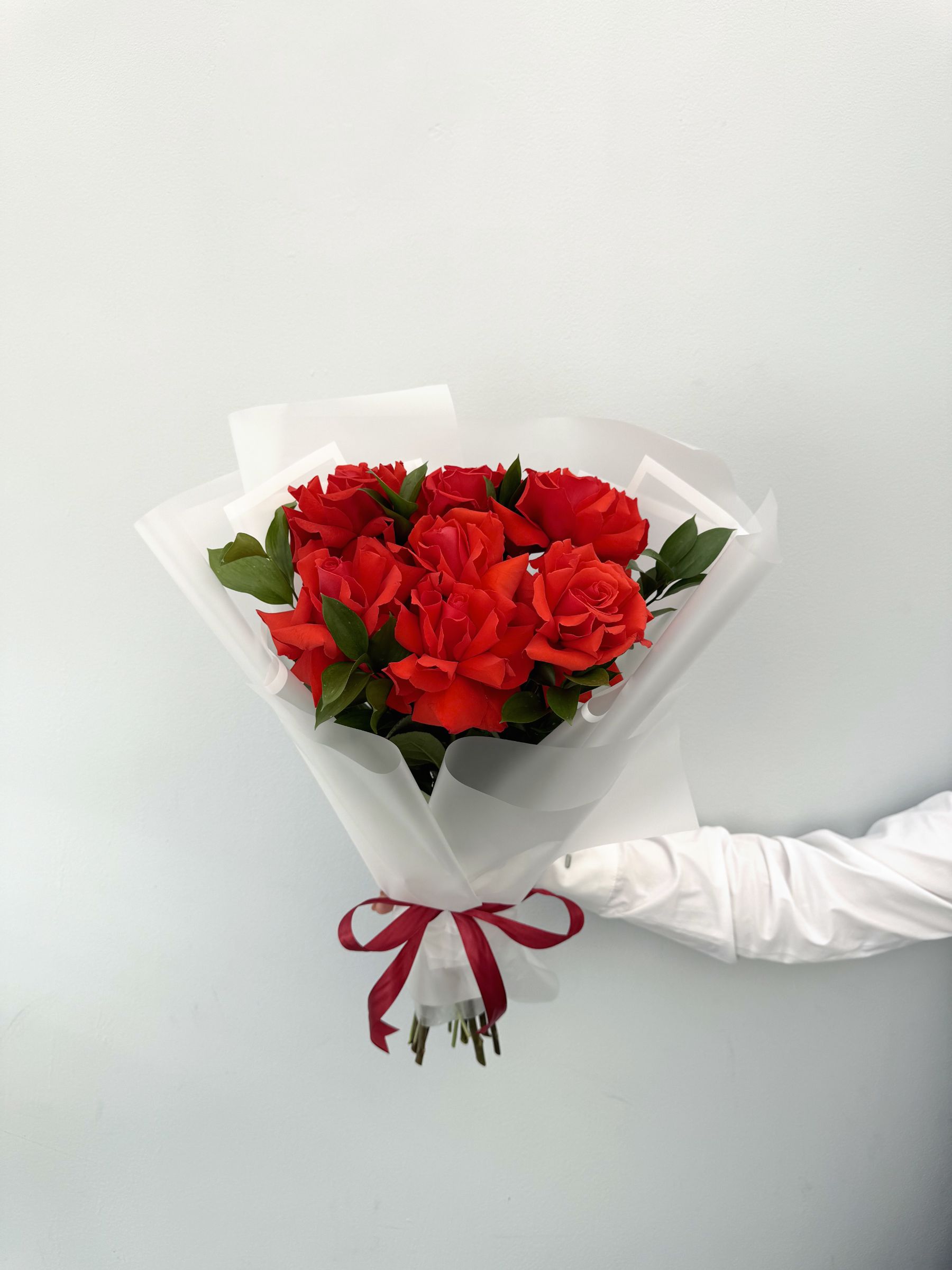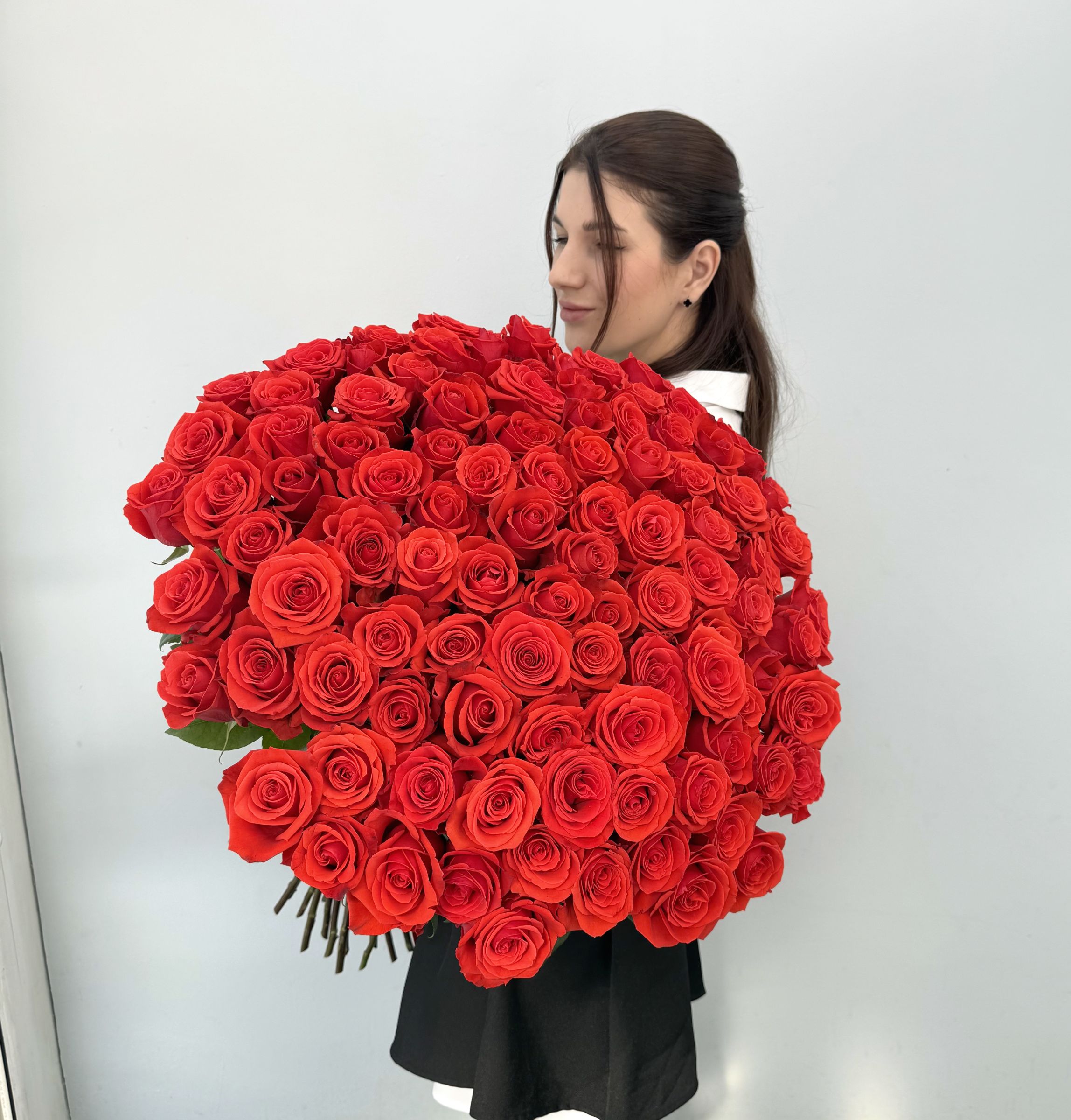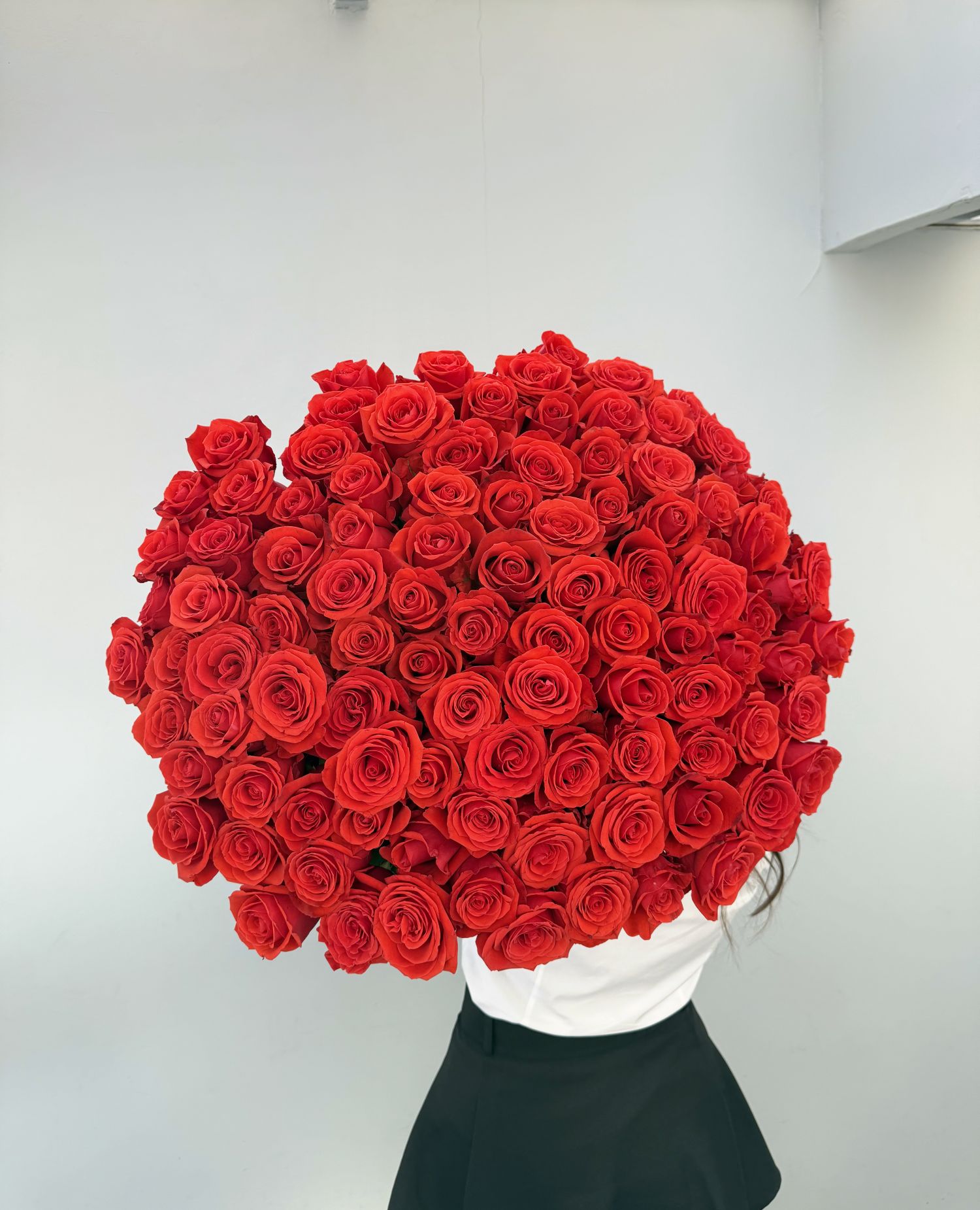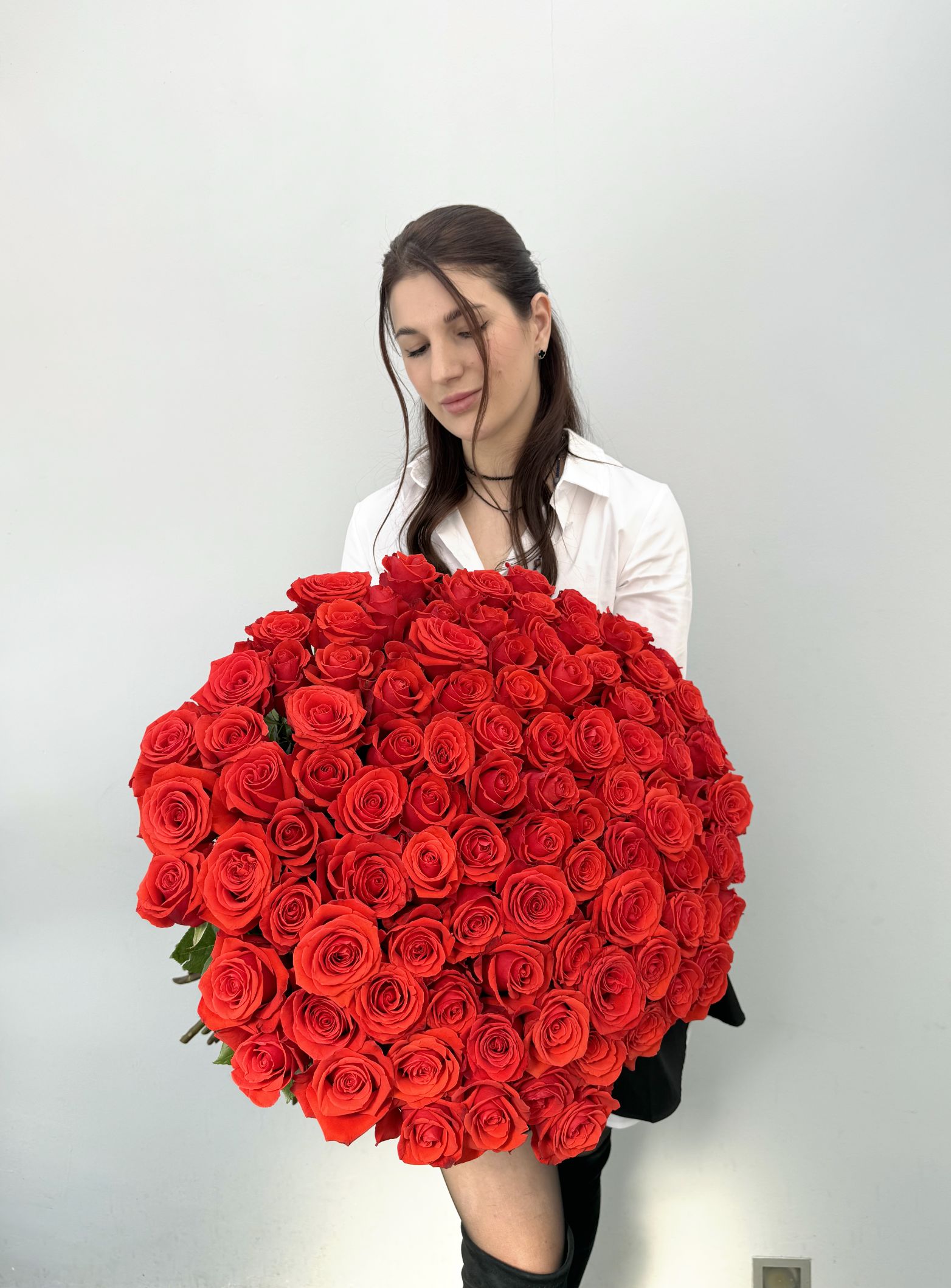 Композиция из 101 алых роз создаёт ощущение мощной, цельной энергии. Чистота линии и насыщенный красный цвет делают букет эффектным и уверенным, словно пульс страсти, который невозможно не заметить. Каждая роза раскрыта идеально, создавая гармоничный, монументальный образ.