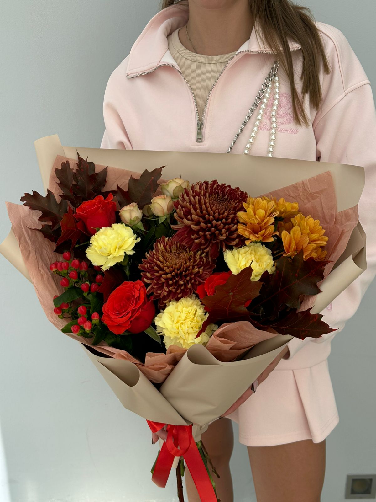 Французская роза и кустовая роза создают цветочный дуэт нежности и стиля, сочная гербера и краспедия вносят смелую графику, а гиперикум и солидаго добавляют живое тепло. Сантини завершает композицию мягкой фактурой, словно лёгкий штрих художника.