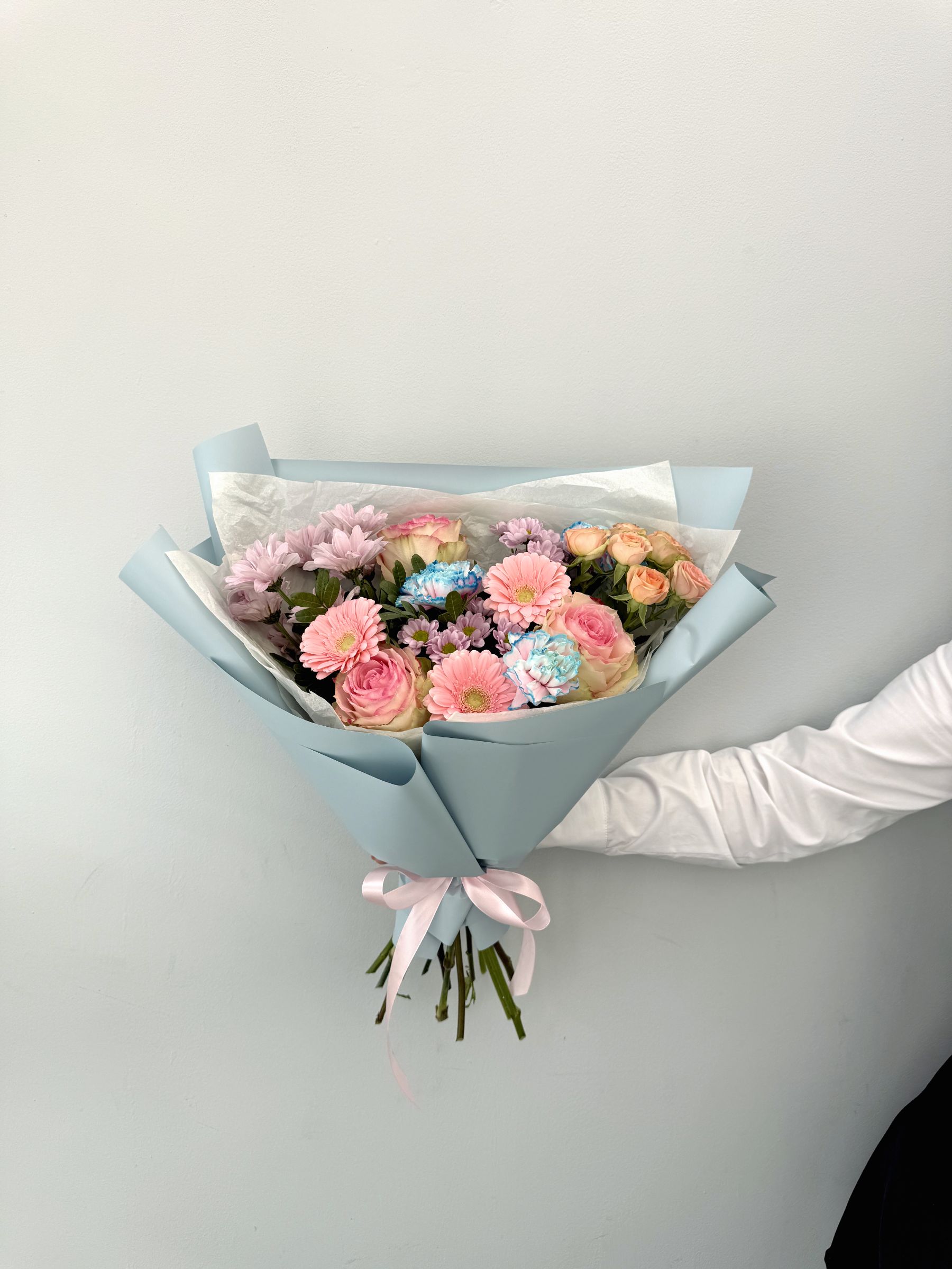 Букет сочетает нежно-розовые розы и герберы с сиреневыми хризантемами и необычными голубыми гвоздиками, создавая лёгкий, свежий ритм. Пастельная голубая упаковка и мягкая лента подчёркивают воздушность и непринуждённость композиции, словно лёгкий ветерок скользит по лепесткам.