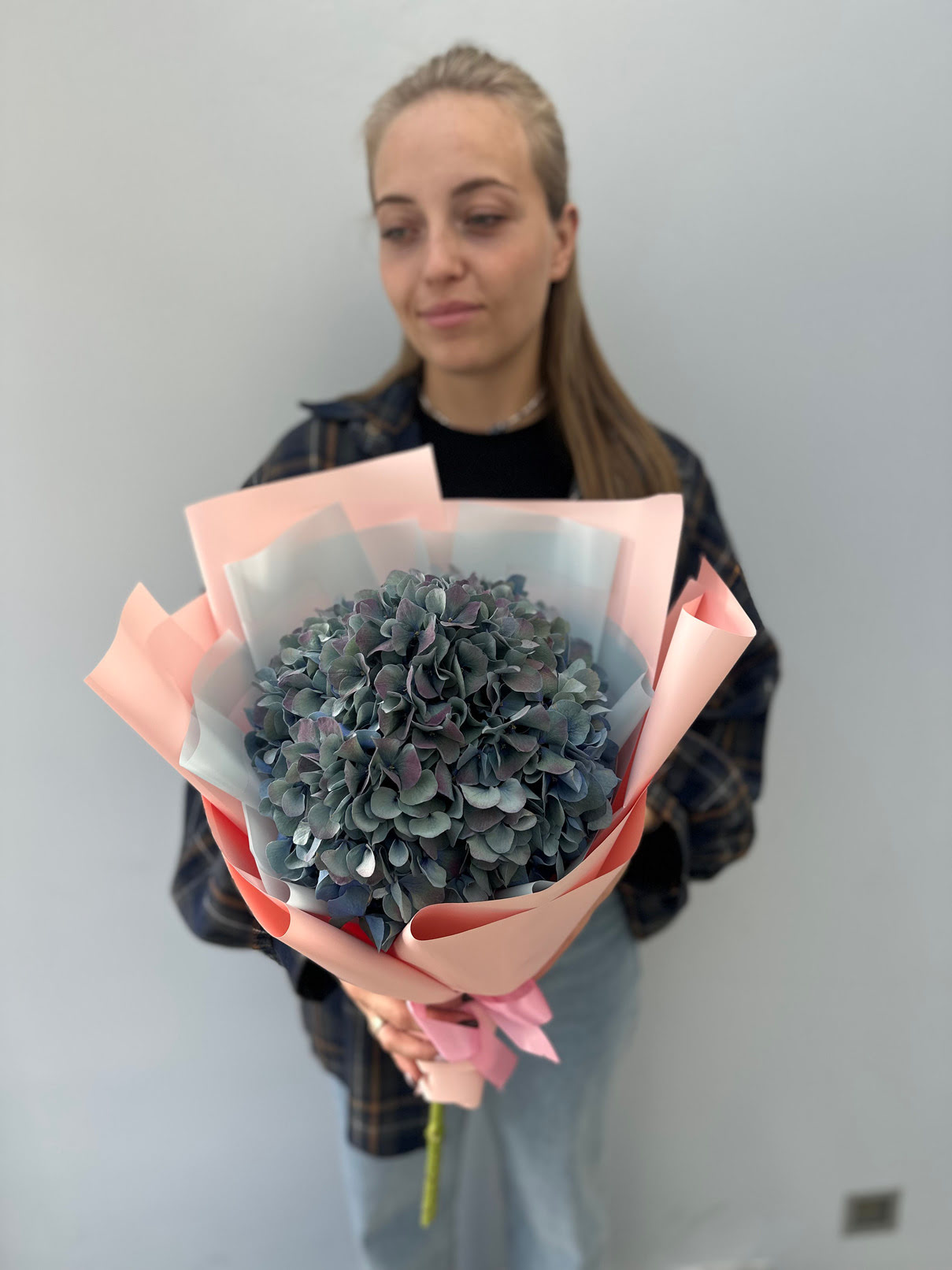 Элегантный букет из одной крупной гортензии нежного серо-фиолетового оттенка, обёрнутой в пастельно-розовую упаковку с лёгкой прозрачностью. Лаконичный и стильный, он словно облако нежности и утончённости, идеально подходит для ценителей минимализма и изысканной простоты.
