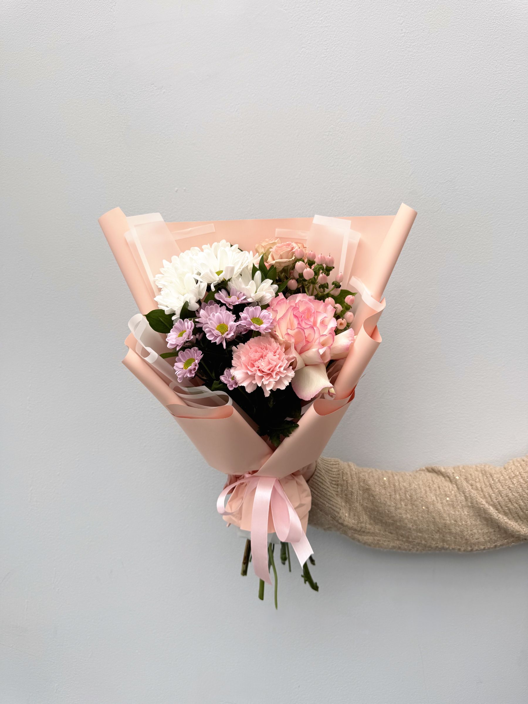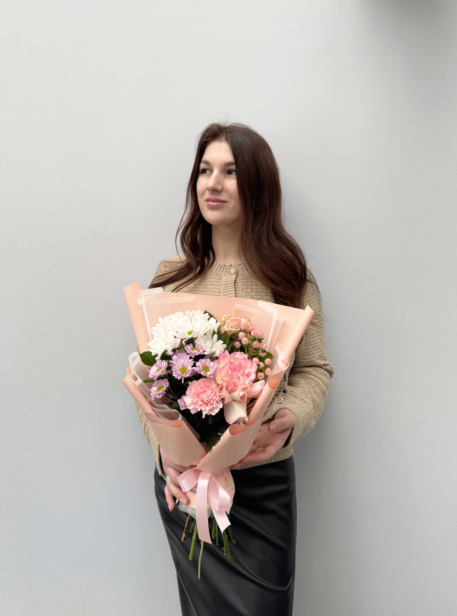 Композиция сочетает белые и сиреневые хризантемы с нежно-розовыми гвоздиками и кустовыми розами, дополнена ягодками гиперикума. Пастельная упаковка подчёркивает мягкость линий, создавая ощущение лёгкости и воздушной гармонии, где каждая деталь будто дышит вместе с букетом.