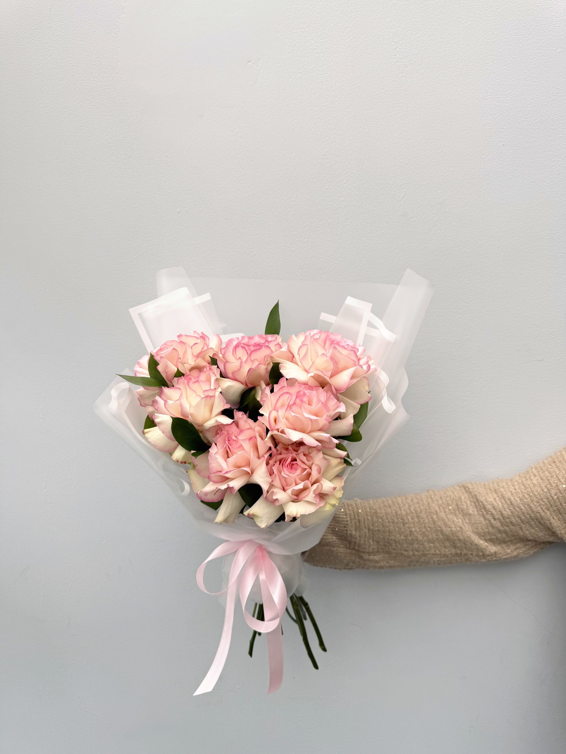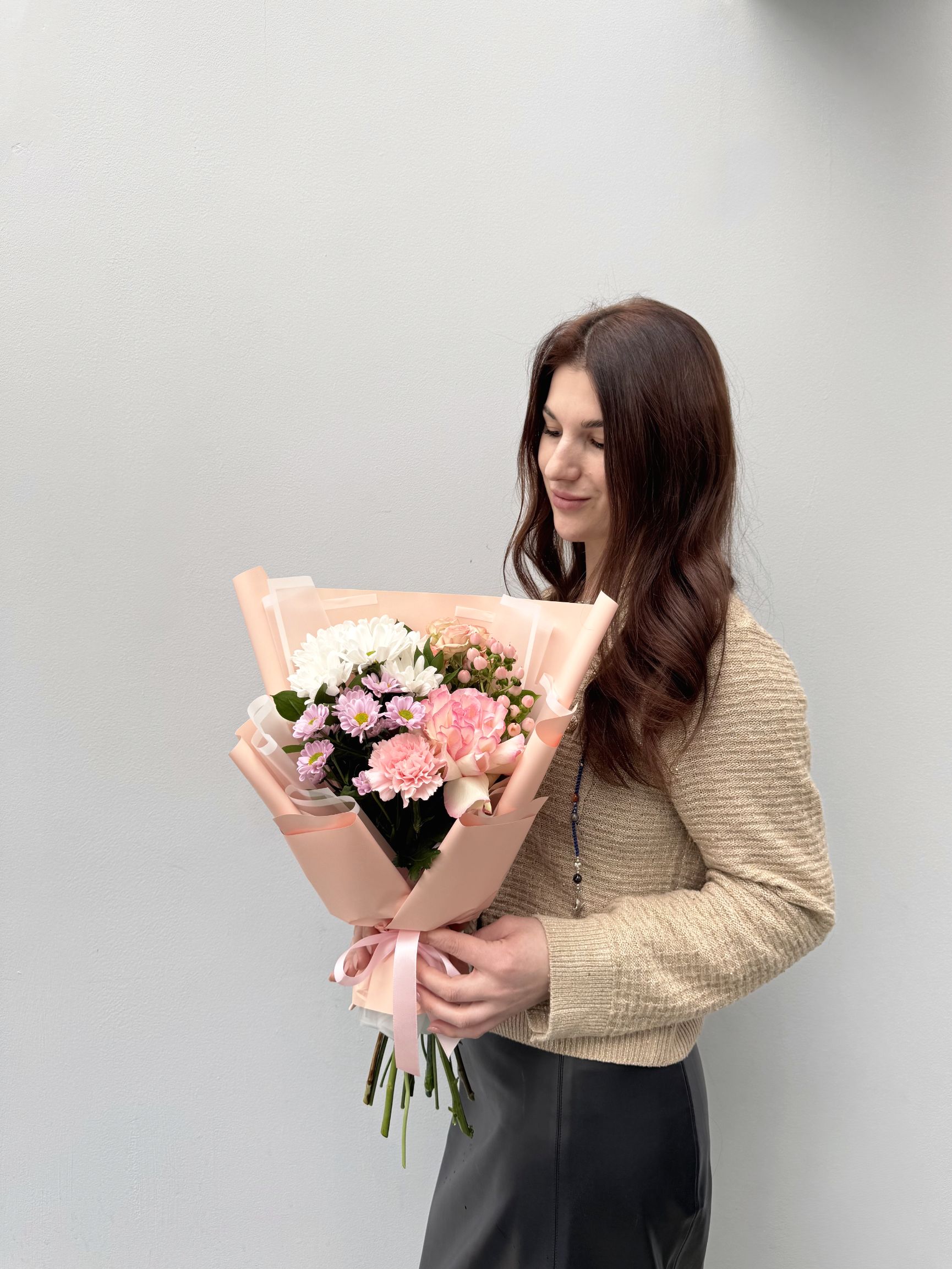 Букет сочетает кремово-розовые розы с яркими мини-гвоздиками, белой хризантемой и эустомой, создавая ощущение свежести и лёгкой утренней нежности. Прозрачная пастельная упаковка подчёркивает воздушность композиции, а гармоничные линии цветов делают образ мягким и светлым, словно первые лучи солнца.