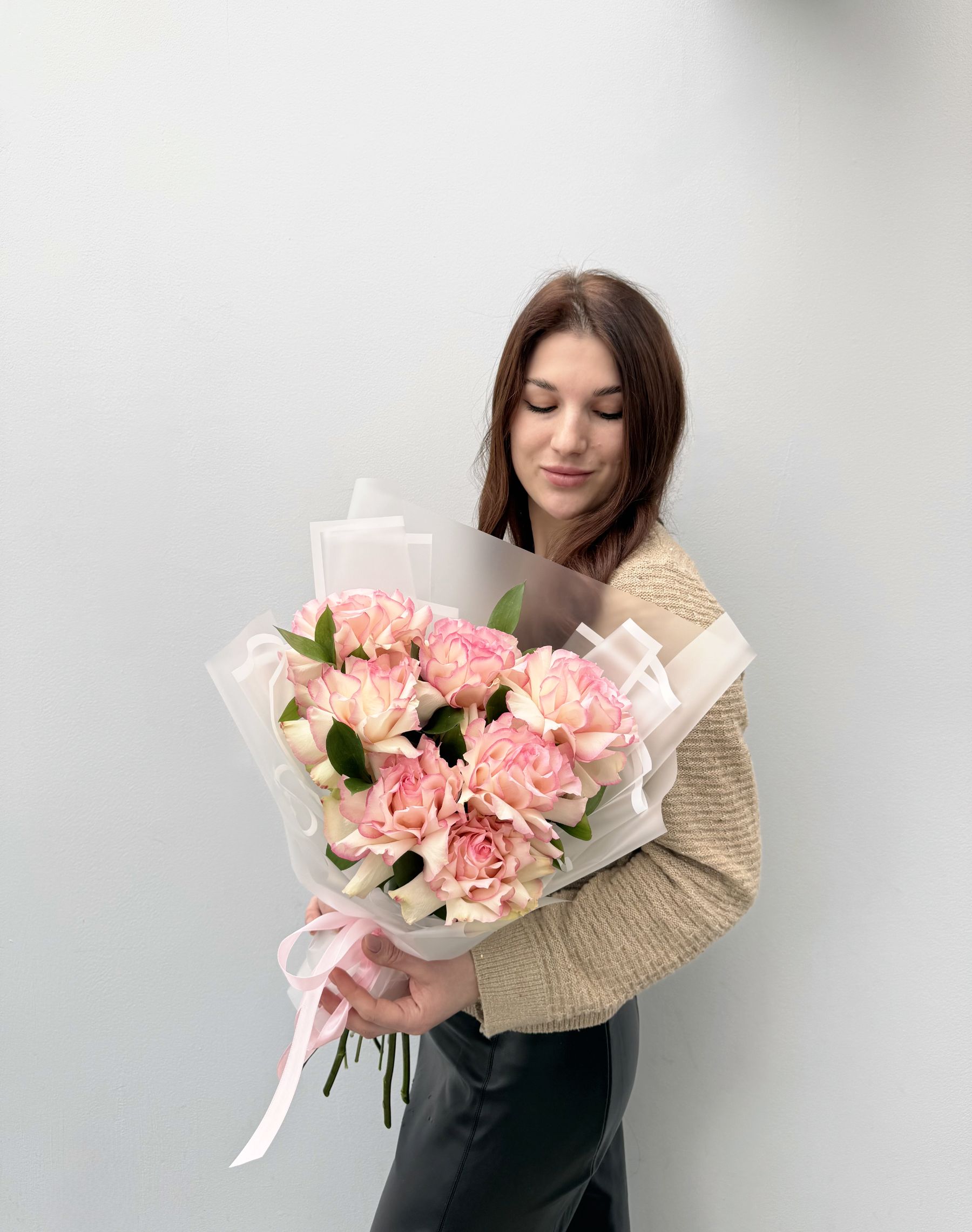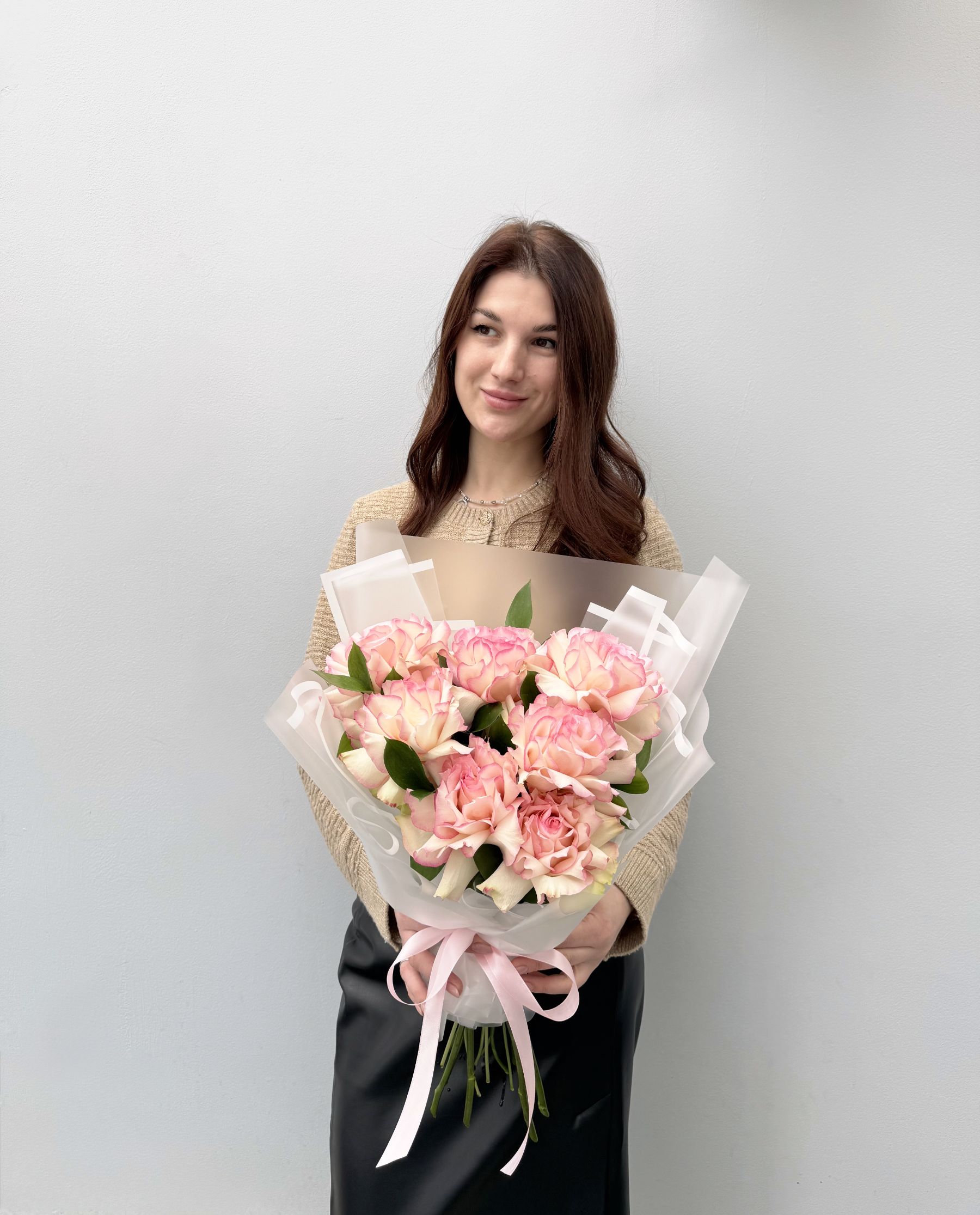 25 роз с нежной розовой сердцевиной и светлым краем — как фарфор с румянцем. Очень женственный, собранный и «дорогой» по ощущению, даже без упаковки.