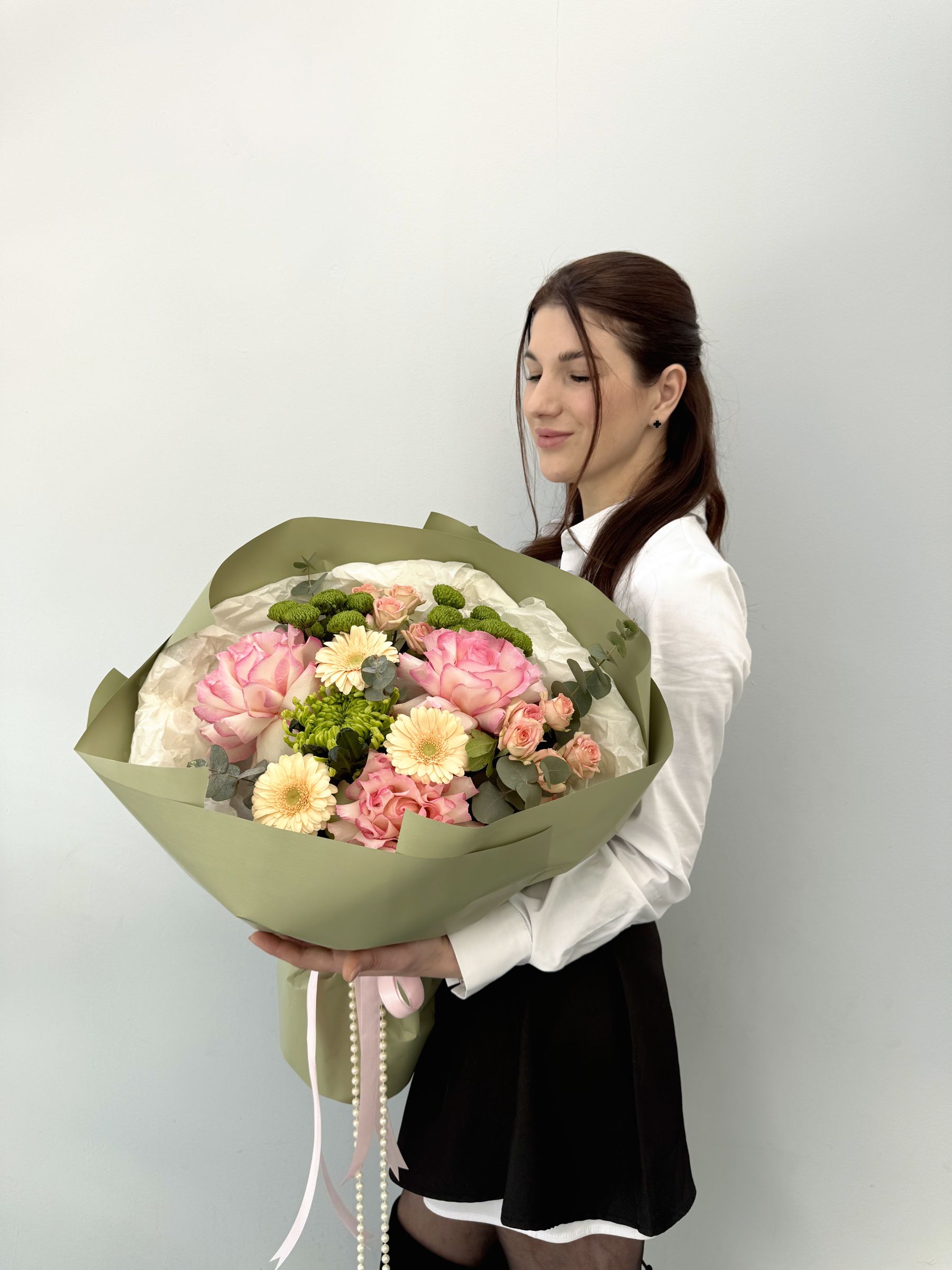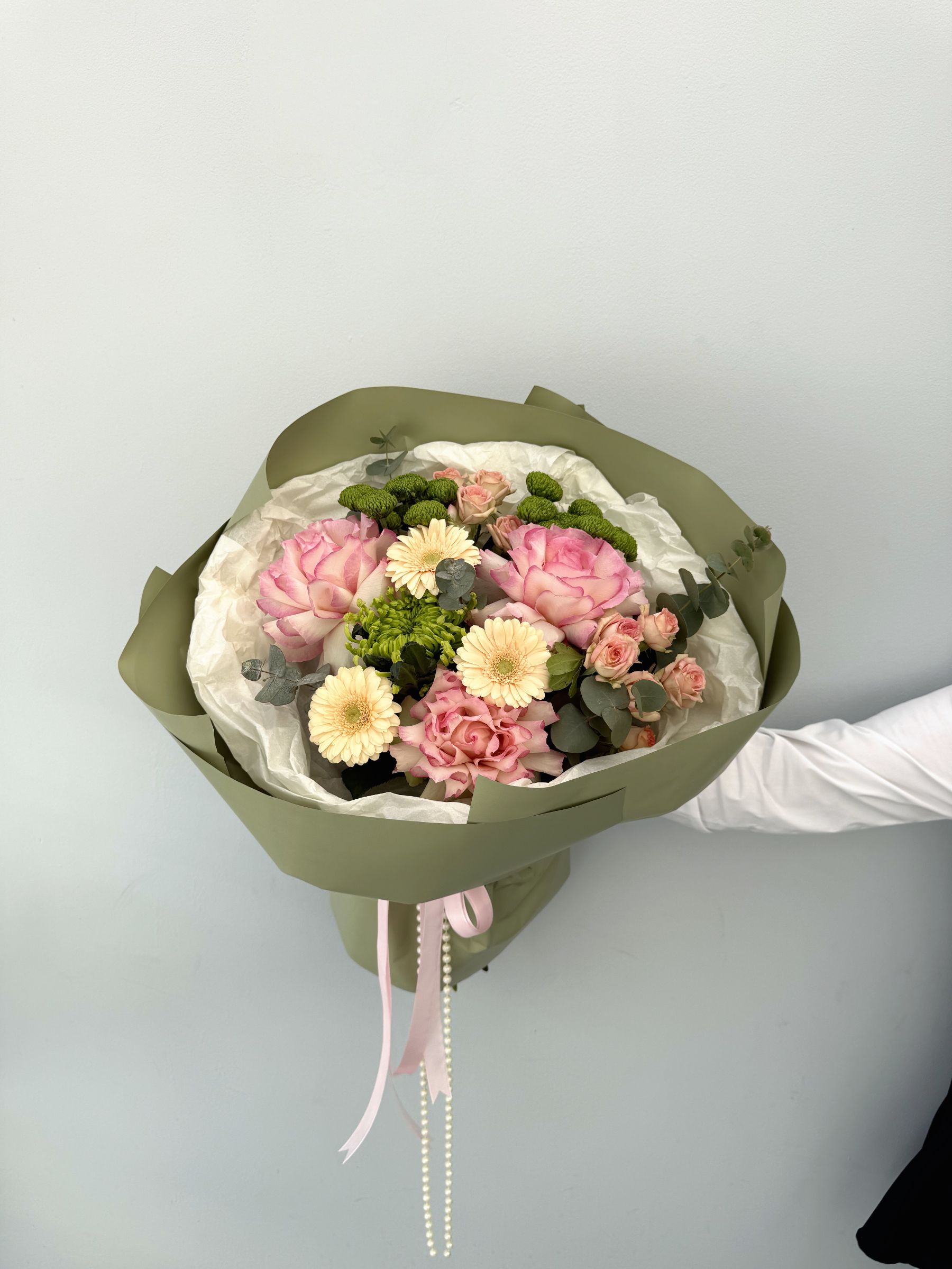 Крупные и кустовые розы с мягкой каймой, пудровые гвоздики и хризантемы звучат как спокойное признание — без повода, просто потому что хочется. Эвкалипт добавляет прохладный штрих, а лента с жемчугом собирает весь образ в одну тонкую, дорогую ноту.